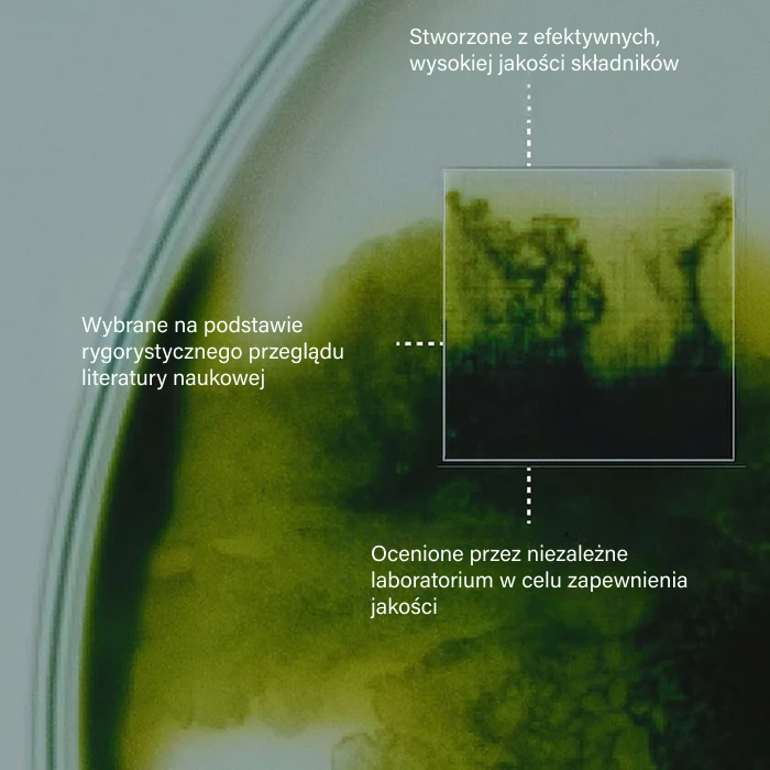Opracowane ze skutecznych i wysokiej jakości składników. Każdy składnik aktywny został wybrany na podstawie rygorystycznego przeglądu literatury naukowej i oceniony przez niezależne laboratorium w celu potwierdzenia jakości. Wszystkie składniki są w 100% wegańskie. Formuła czerpie inspirację z natury – wiele składników aktywnych jest pochodzenia naturalnego lub zostało wytworzonych tak, aby odzwierciedlać tę samą strukturę molekularną.